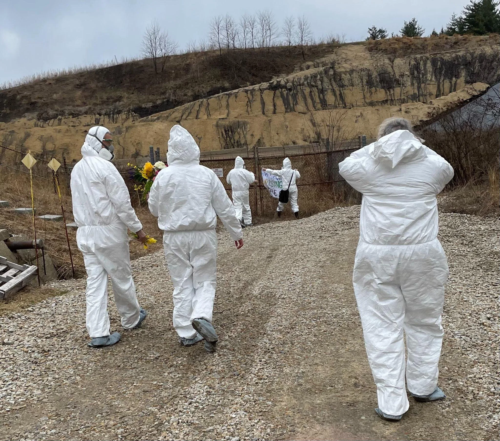 Bow, New Hampshire – On April 9, Nine New England activists held a Healing Ceremony at the ash disposal site for the Merrimack Station in Bow, NH, the last coal plant in the region. Dressed in tyvek suits and respirators, they gathered to honor the Earth and heal the desecration caused by the dumping of toxic coal ash. After decorating the fence with flowers and posters, the activists performed the “Elm Dance”- a Latvian ceremony originally created for the healing of Chernobyl.
